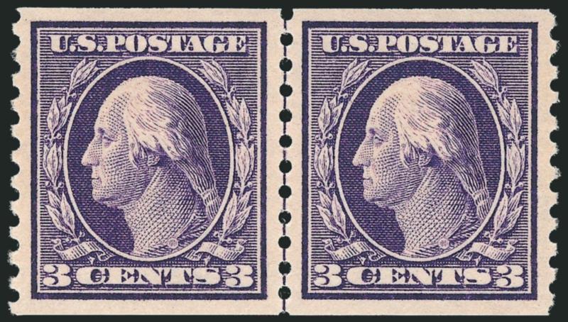 EXTREMELY FINE GEM. THIS MAGNIFICENT MINT NEVER-HINGED GUIDE LINE PAIR OF THE 3-CENT COIL, SCOTT 445, IS WITHOUT QUESTION ONE OF THE FINEST IN EXISTENCE. THIS GUIDE LINE PAIR HAS BEEN GRADED SUPERB 98 BY P.S.E. -- THIS IS THE HIGHEST GRADE AWARDED TO DATE AND THE ONLY EXAMPLE TO ACHIEVE THIS GRADE.