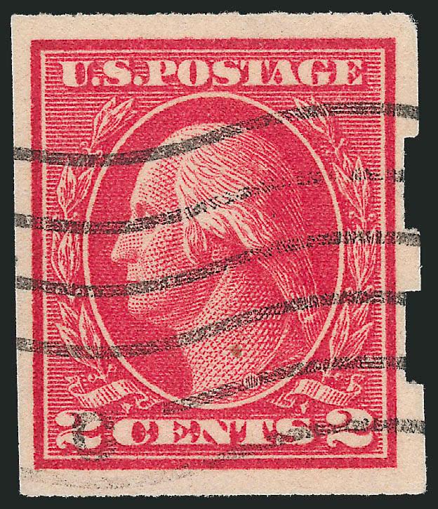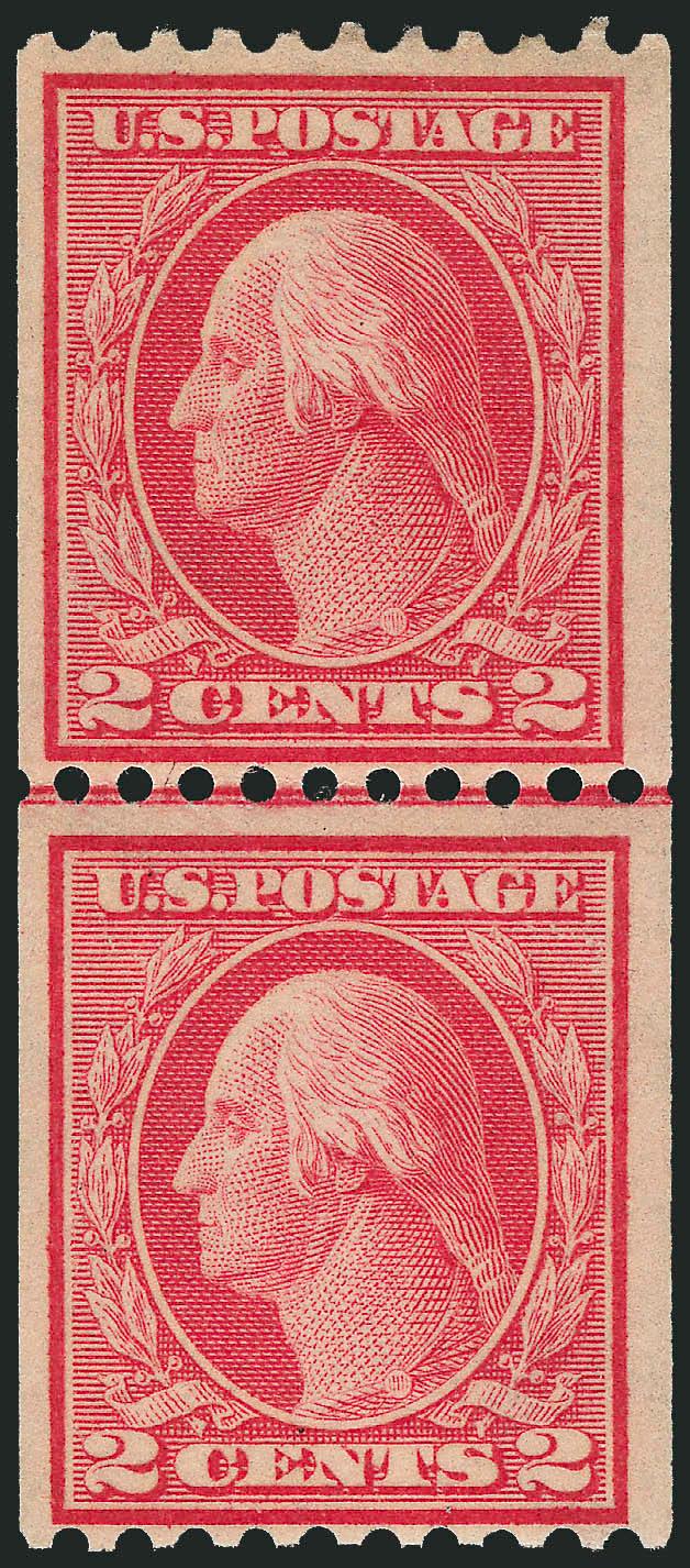 The 2c Type I rotary plate was used very briefly to make vertical coils issued in late 1915. It was briefly used because the Type I plate was not very deeply engraved and the curvature of the rotary press yielded impressions lacking in some of the details. The Bureau noticed this immediately, and quickly replaced it with the Type III plate (according to Scott, the EDU for No. 449 is Oct. 29, 1915 and the EDU for Type III is Dec. 21, 1915).
