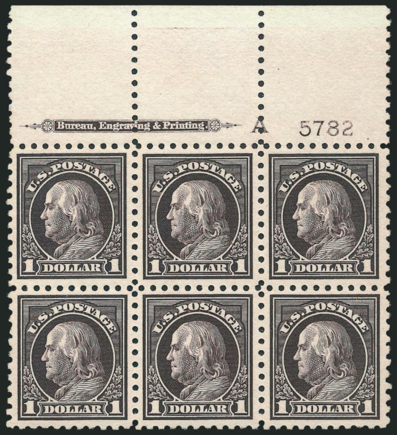 EXTREMELY FINE. AN INCREDIBLY RARE MINT NEVER-HINGED PLATE BLOCK OF THE $1.00 PERF 10 UNWATERMARKED FRANKLIN ISSUE WITH WIDE TOP SELVAGE.
