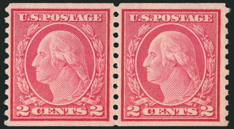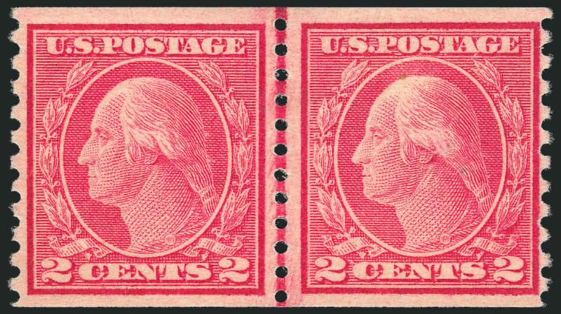This coil is surprisingly rare in Mint N.H. condition. A review of our computerized records, which spans 14 years of our auctions, revealed only two other Mint N.H. pairs.