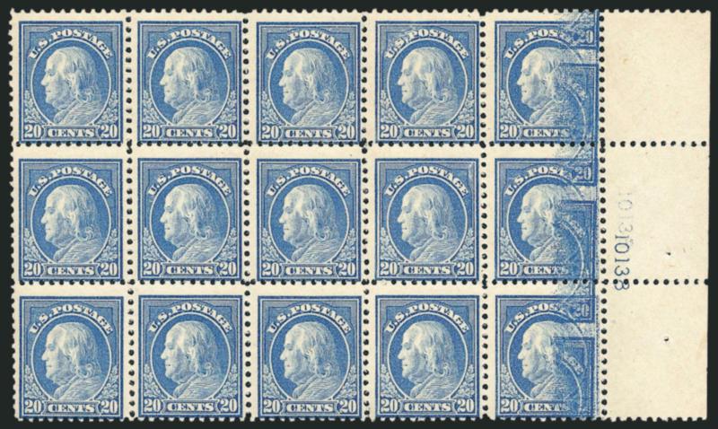 As far as we can determine, only one sheet of the 20c Perf 11 double impression reached collectors, with the doubling along the right side, which would make this plate block unique.