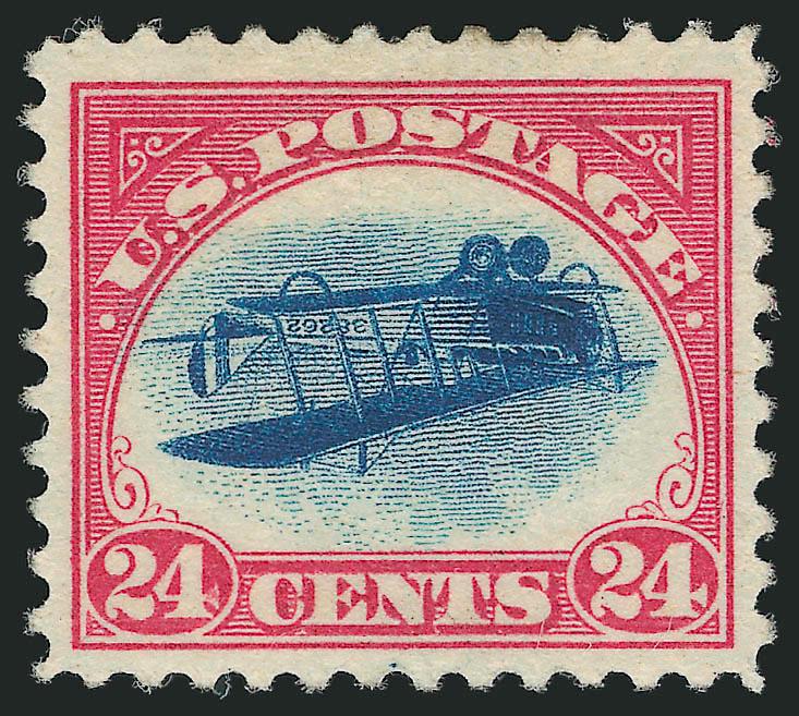 FINE. A REMARKABLY FRESH AND BEAUTIFULLY CENTERED EXAMPLE OF THE FAMOUS 1918 24-CENT INVERTED "JENNY". THIS STAMP IS ONE OF THE BEST-CENTERED POSITIONS FROM THE DISCOVERY SHEET. According to Jenny by George Amick (Amos Press, 1986), the