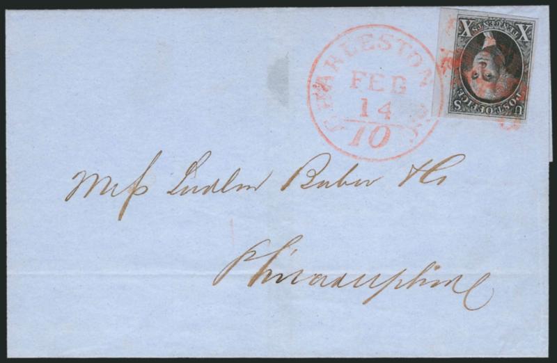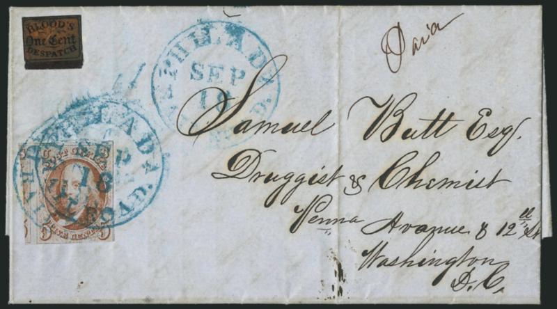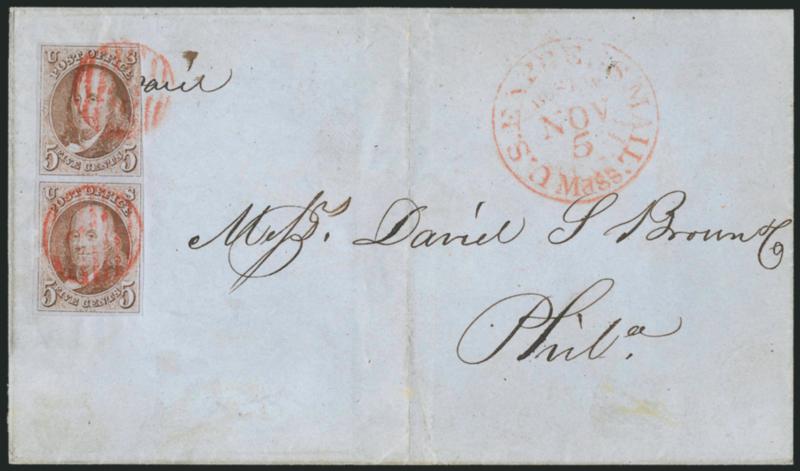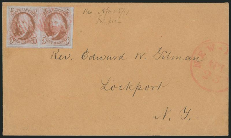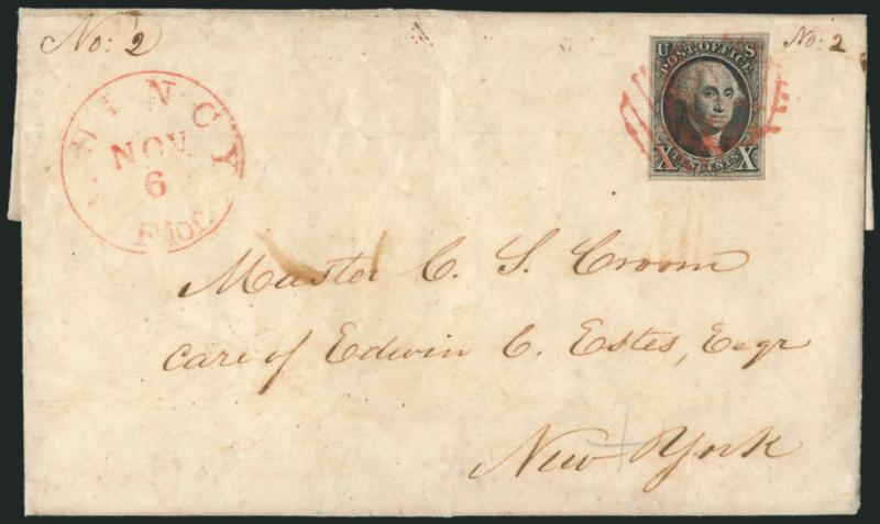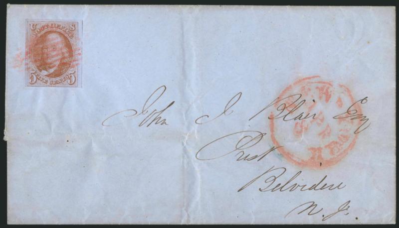 VERY FINE. THE RED ORANGE IS THE RAREST OF ALL 5-CENT 1847 SHADES AND IS EXTREMELY DIFFICULT TO FIND ON COVER, ESPECIALLY IN SUCH CHOICE CONDITION.
