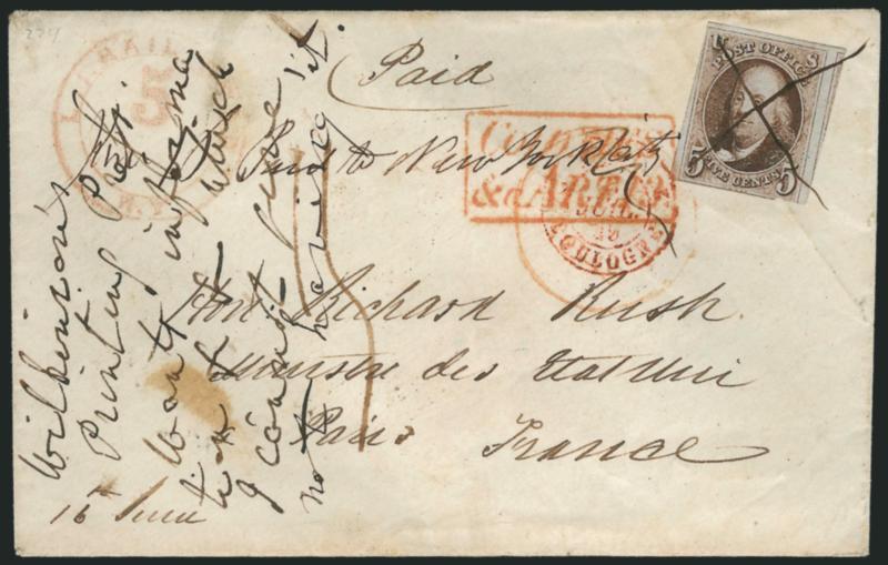 FINE. A RARE USE OF THE 5-CENT 1847 ISSUE TO FRANCE AND THE ONLY RECORDED EXAMPLE OF THE LONG ISLAND RAILROAD ROUTE AGENT'S MARKING ON COVER TO A FOREIGN DESTINATION.