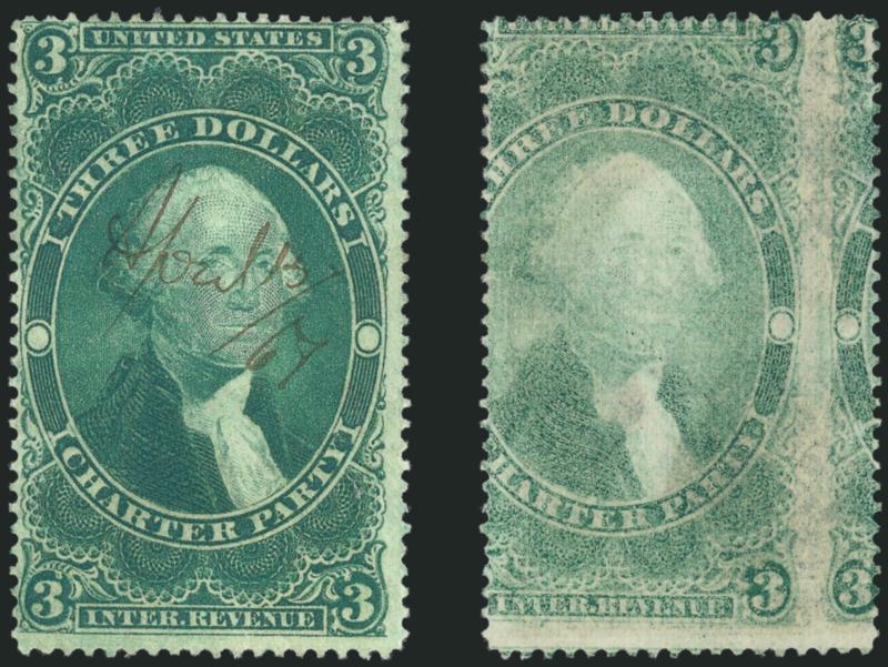 VERY FINE APPEARANCE. A RARE EXAMPLE OF THE $3.00 CHARTER PARTY WHICH IS PRINTED ON BOTH SIDES, WITH THE SAME DESIGN ON BOTH FRONT AND BACK. A GREAT RARITY OF REVENUE COLLECTING.