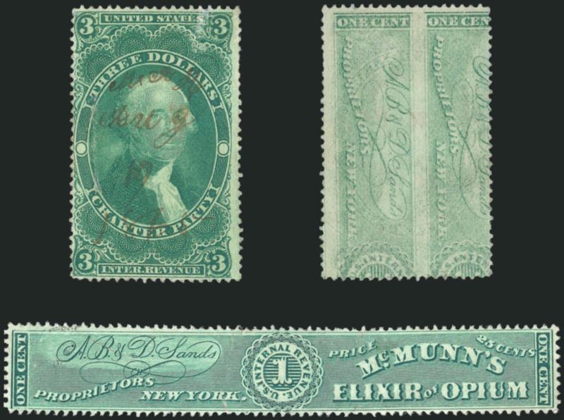 VERY FINE APPEARANCE. THIS IS THE UNIQUE STAMP PRINTED ON BOTH SIDES WITH THE $3.00 CHARTER PARTY FIRST ISSUE REVENUE ON ONE SIDE AND THE DR. McMINN'S ELIXIR OF OPIUM PRIVATE DIE PROPRIETARY ISSUE ON THE OTHER. ONE OF THE GREATEST AND MOST REMARKABLE OF ALL PHILATELIC RARITIES.