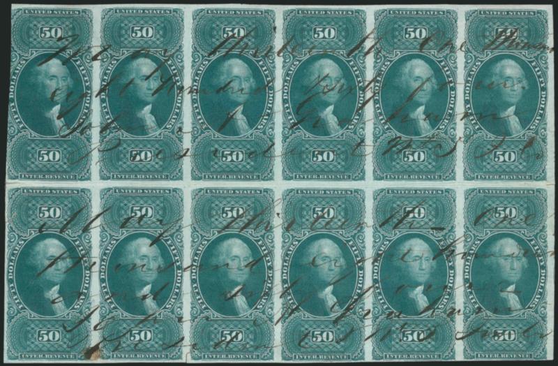 VERY FINE APPEARANCE. THIS IS THE LARGEST RECORDED MULTIPLE OF THE $50.00 U.S.I.R. IMPERFORATE.