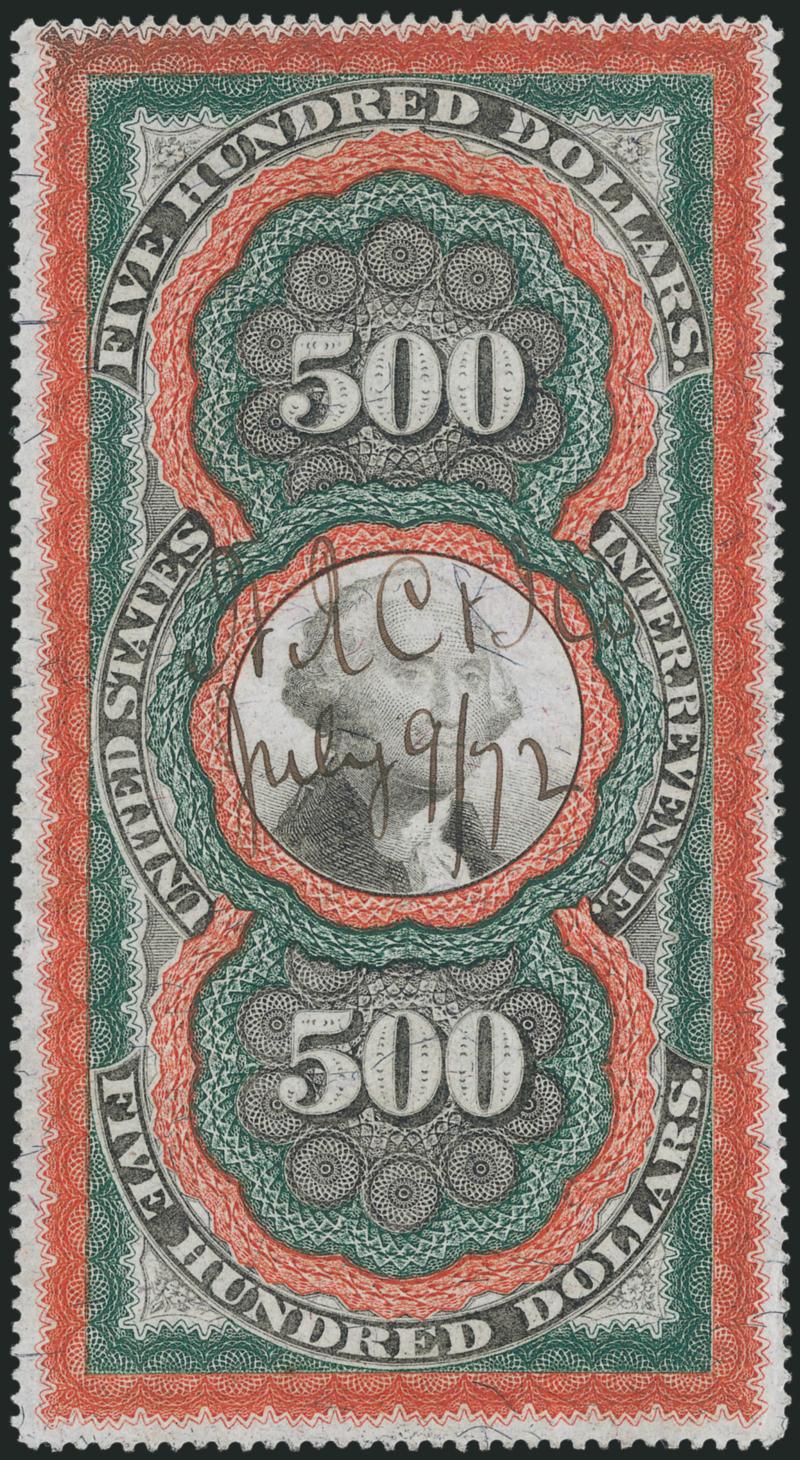 Examples of the $5.00 Proprietary Issue almost invariably have faults, due to the stamp's large size and the nature of its use. An example with large part original gum, a small thin and small sealed tears, realized $7,000 hammer in our Sale 836.
