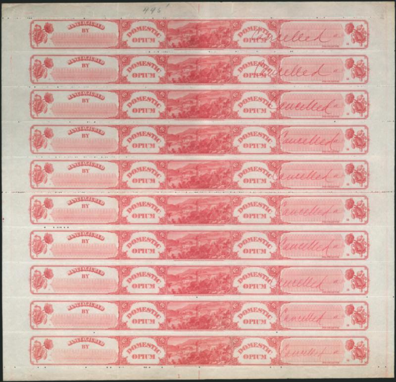 According to the Index to the Executive Documents of the House of Representatives from 1879-80, available at http://books.google.com/books?id=jlhHAQAAIAAJ: "Large quantities of Opium prepared for smoking are brought into the United States, and this article, being of small bulk and great value, is easily smuggled. A similar article is manufactured in the United States from the crude opium, and in endeavoring to ascertain whether, in any given case, the article has been smuggled, it has been found difficult to determine whether it is of domestic or foreign manufacture." The document continues with a recommendation for both external and internal taxes upon opium and that "opium prepared for smoking, imported into the United States or manufactured in the United States, found without proper stamps, be made liable to seizure and forfeiture." The recommendation was that tax for internal production be equal to that imported, which was $6.00 per pound. (Image)