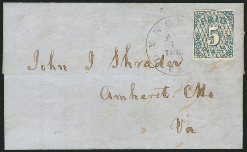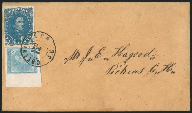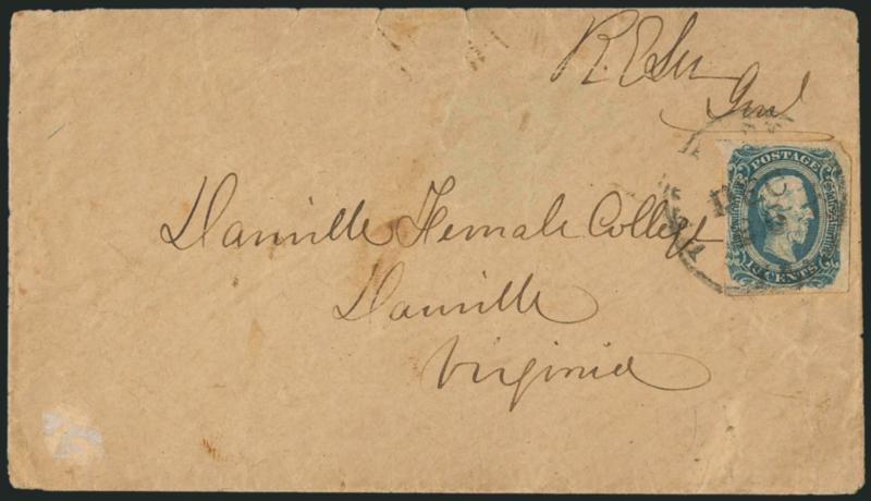 Of the 20 single Lynchburg provisional stamps known on cover, only six or seven have four full margins, while the majority is cut into on one side. (Image)
