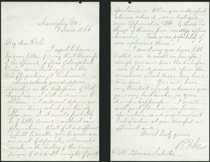 At the time this letter was written, Lee was serving as president of Washington College, which was later renamed Washington and Lee University. Shortly after the war ended he began to attempt to gather sources that would allow him to write his memoirs. After 1866 he largely put the project aside and never did advance it very far before he died in 1870. This letter, written to the former chief of staff of Lee's most senior subordinate in the Army of Northern Virginia, 1st Corps Commander Lt. Gen. James Longstreet, is an example of Lee's efforts to obtain records that would assist in this effort.