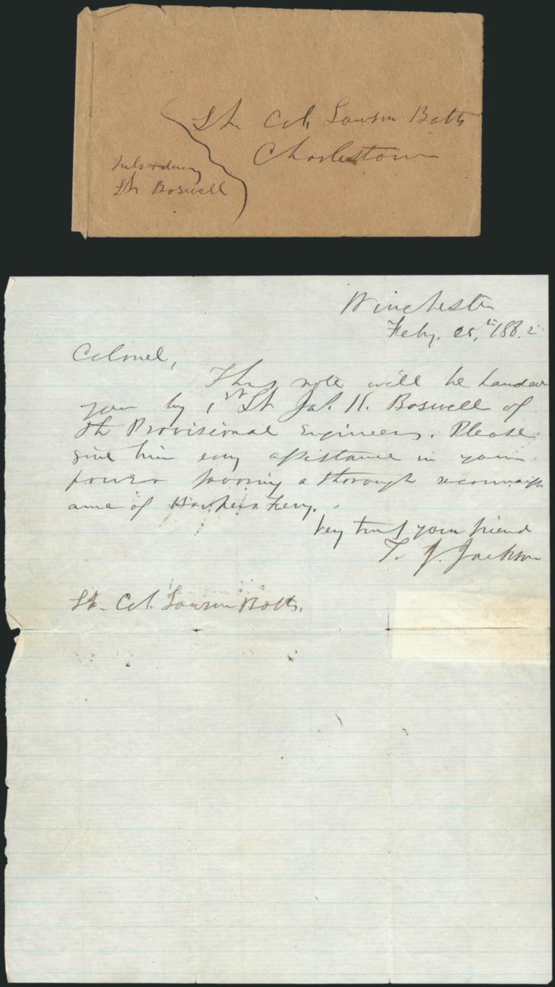 VERY FINE. A DESIRABLE AND RARE CIVIL WAR LETTER SIGNED BY THOMAS J. "STONEWALL" JACKSON, WITH THE ORIGINAL COVER WRITTEN IN JACKSON'S HAND.