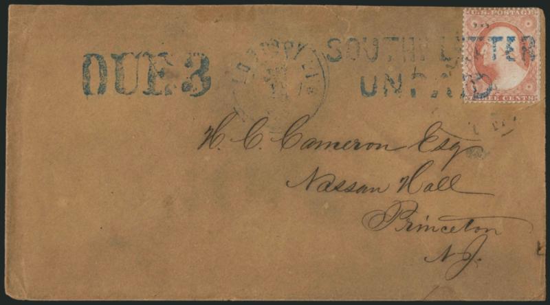 A FINE AND RARE EXAMPLE OF THE "SOUTHERN LETTER UNPAID" HANDSTAMP.