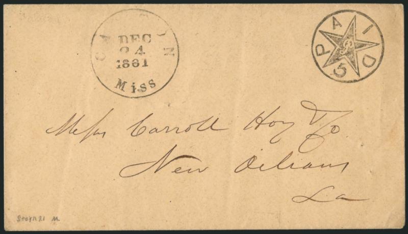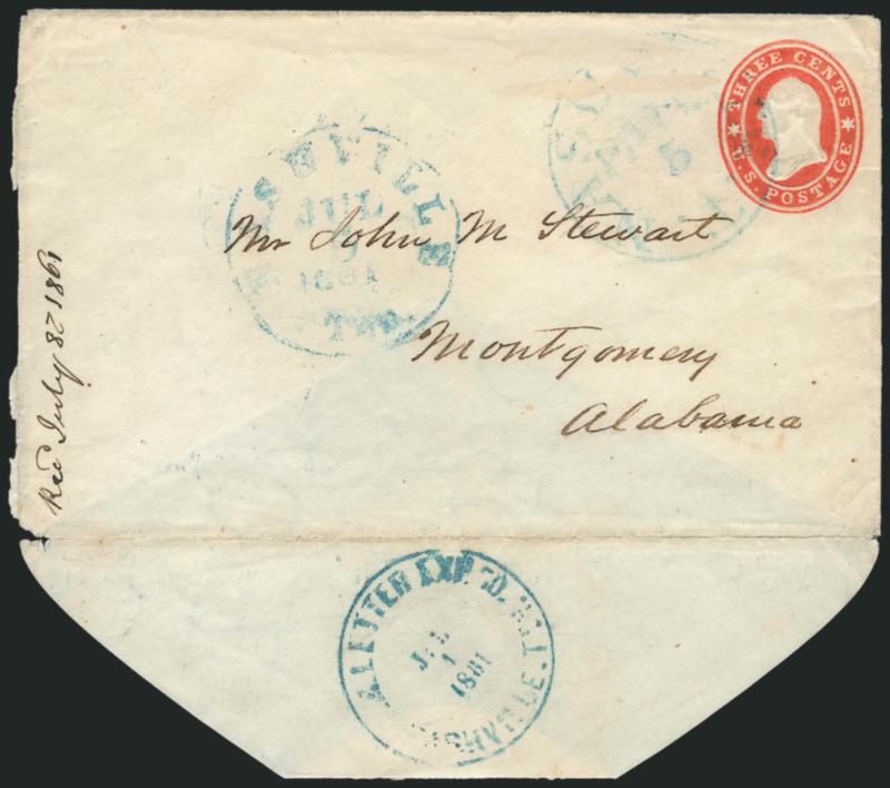 Of the 31 recorded North-to-South covers carried by American Letter Express Co., only three have the "Nashville T. Paid 5" provisional handstamp. Those put into the mails at Nashville usually have the "Paid" straightline in combination with "5" or "10" rate handstamps. It is also an extremely rare example of the American Letter Express Co. Nashville office datestamp.