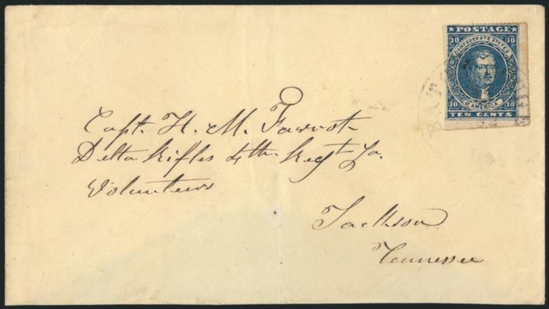 VERY FINE. ONE OF THREE RECORDED COVERS WITH THE 10-CENT LITHOGRAPH UNOFFICIAL BATON ROUGE PERFORATION -- ALSO A VERY EARLY DATE FOR A BATON ROUGE ROULETTED STAMP. A MAJOR RARITY OF THE CONFEDERATE STATES.