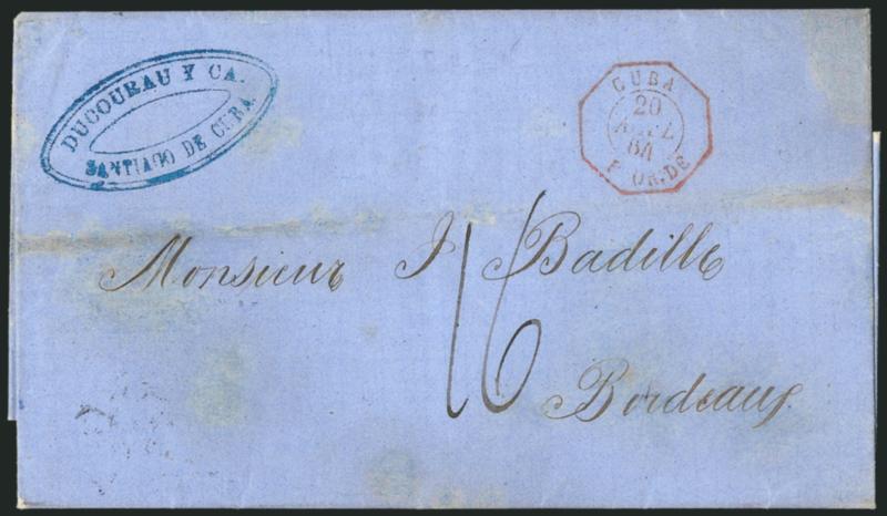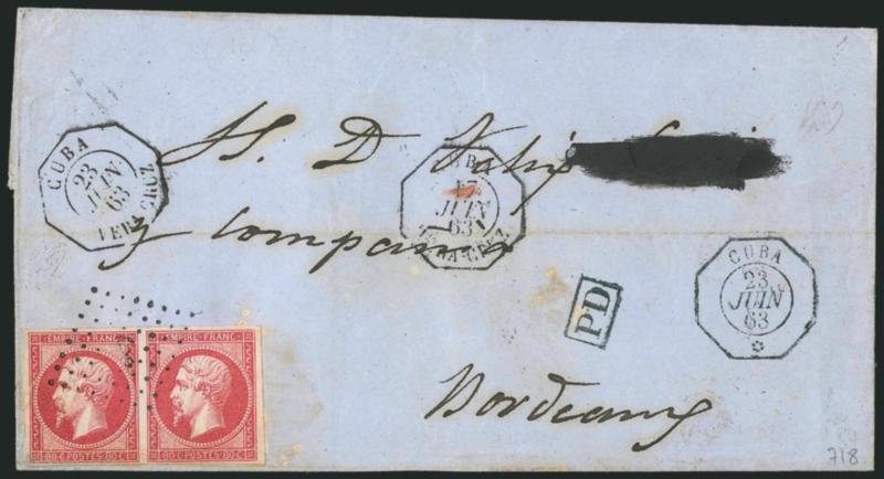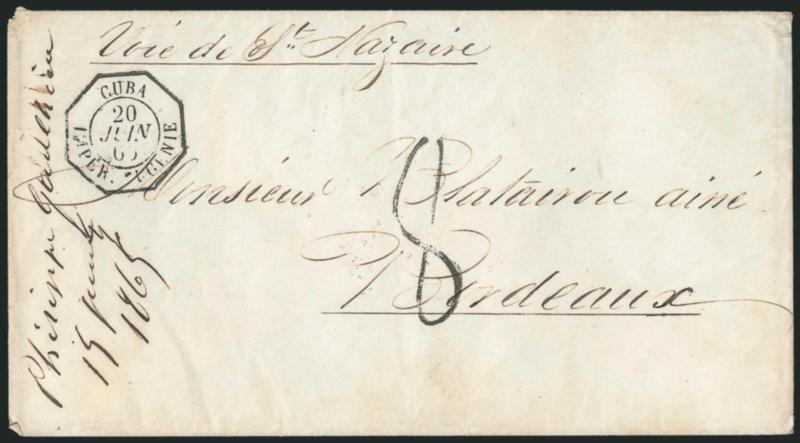VERY FINE APPEARANCE. THIS IS THE HIGHEST REPORTED FRANKING FROM CUBA SENT BY THE FRENCH PACKET SERVICE. IT IS ALSO ONE OF ONLY TWO RECORDED EXAMPLES OF THE FRANCE 5-FRANC LAUREATED ISSUE USED FROM CUBA. A GREAT RARITY.