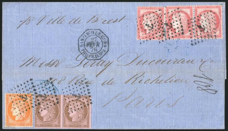 VERY FINE. AN ATTRACTIVE THREE-COLOR FRANKING FROM SANTIAGO DE CUBA TO FRANCE.