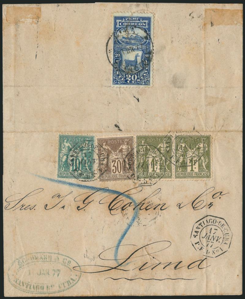 VERY FINE. A SCARCE AND COLORFUL FRANKING COMBINING THREE DIFFERENT FRENCH STAMPS WITH THE PERUVIAN POSTAGE DUE STAMP.