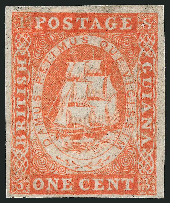VERY FINE AND CHOICE. A BEAUTIFUL ORIGINAL-GUM EXAMPLE OF THE BRITISH GUIANA ONE-CENT VERMILION FROM THE ORIGINAL PRINTING.