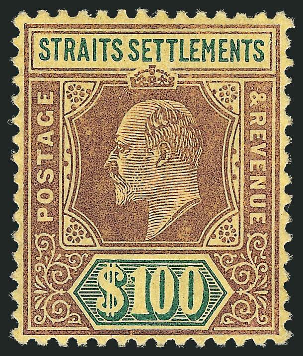 EXTREMELY FINE. A BEAUTIFUL AND RARE ORIGINAL-GUM EXAMPLE OF THE $100 1910 STRAITS SETTLEMENTS KING EDWARD VII ISSUE.