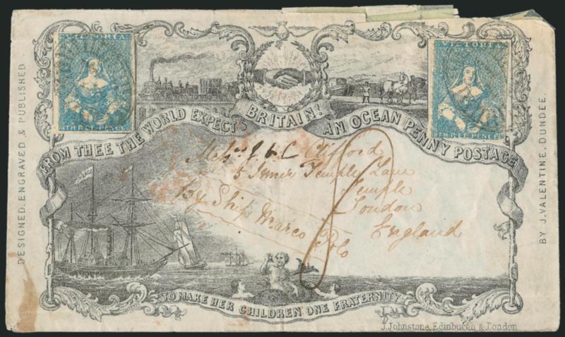 VERY FINE. A BEAUTIFUL AND RARE EXAMPLE OF J. VALENTINE'S OCEAN PENNY POST PROPAGANDA ENVELOPE USED FROM AUSTRALIA TO ENGLAND, WITH ONE OF THE VICTORIA STAMPS AFFIXED OVER THE ALLEGORICAL FIGURE OF PEACE AT LEFT ESPECIALLY DESIRABLE AS THIS WAS CARRIED ON THE CLIPPER SHIP MARCO POLO ON THE FIRST TRIP BACK TO LIVERPOOL.