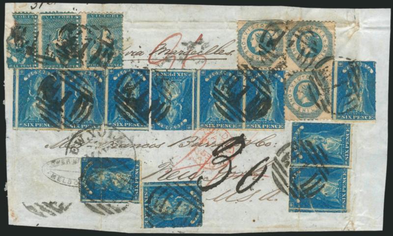 If this were a full cover it might well be regarded as the most spectacular Victoria cover in existence. Even as a front, it is very desirable and a most impressive franking (Image)