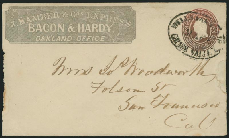 1153 c ImageJ. Bamber & Cos. Express, Bacon & Hardy, Oakland Office. Printed frank (Haller FB2, Ty. 5) on 3c Pink entire (U34) to San Francisco, conjunctive use with "Wells, Fargo & Co. Grass Valley Mar. 8" oval datestamp, insect nibbling at sides (repaired at right), otherwise Fine, scarce frank with Bamber's Oakland agents' names, ex Edwards (Image)