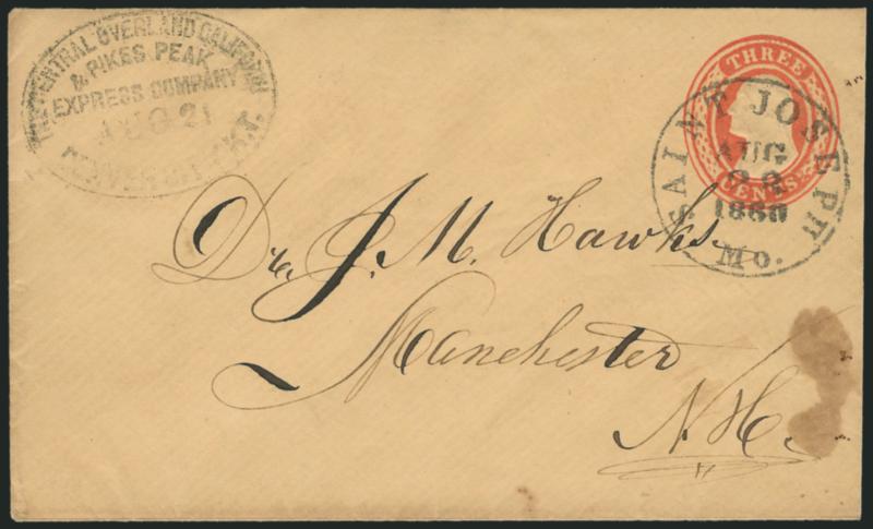 1154 c ImageThe Central Overland California & Pikes Peak Express Company, Denver City K.T., Aug. 21. Oval datestamp on 3c Red Nesbitt entire with bold "Saint Joseph Mo. Aug. 28, 1860" circular datestamp to Manchester N.H., "The Central Overland California & Pikes Peak Express Company, St. Joseph Mo. Aug. 31" oval backstamp, small insignificant stain at lower right, otherwise Very Fine, the cover was carried by the express from Denver City to St. Joseph where it was placed in the mails and carried on to Manchester N.H., ex Meroni and Hall (Image)