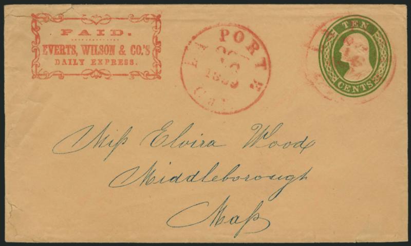 1156 c ImageEverts, Wilson & Co.'s Express. Red printed frank (Haller FE9, Ty. 2) on 10c Green Nesbitt entire (U16) addressed in blue to Middleborough Mass., entered mails with two strikes of red "La Porte Cal. Oct. 16, 1859" circular datestamp, negligible opening tears (one at top touches frank), still Very Fine, scarce transcontinental use and unusually colorful, ex Dale-Lichtenstein (Image)