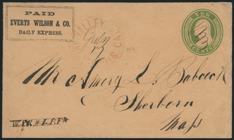 1157 c ImageEverts, Wilson & Co.'s Express. Printed frank (Haller FE9, Ty. 2b) on 10c Green Nesbitt entire (U16) to Sherborn Mass., red "Strawberry Valley Cal." circle with ms. July 17 date, small piece of backflap missing, edges cosmetically improved, Very Fine, this frank is unlisted in Haller on U16 entire, very scarce (Image)