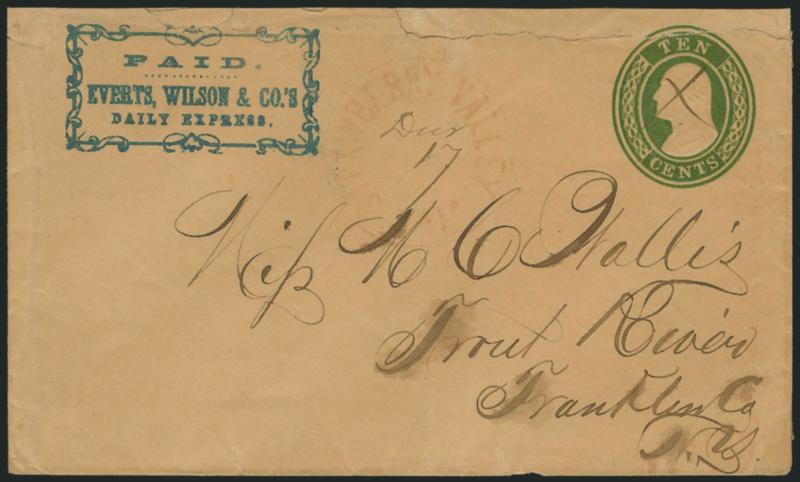 1158 c ImageEverts, Wilson & Co.'s Express. Printed frank in blue (Haller FE9, Ty. 2) on 10c Green Nesbitt entire (U16) to Trout River N.Y., entered mails with faint red "Strawberry Valley Cal." circular datestamp (Dec. 17 in ms.), opening tear along top and mended nick above frank, still Fine, the blue frank is extremely rare and possibly unique on a 10c entire, ex Worthington, Dale-Lichtenstein (Image)