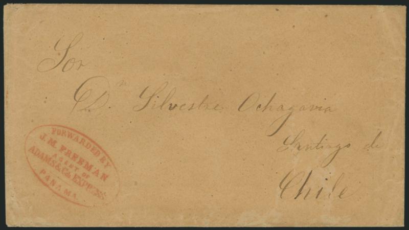 1159 c ImageFreeman & Co.'s Express. Three covers, first red "Freeman & Co.'s Express San Francisco." oval handstamp on part-printed bill of lading datelined at Panama, Jun. 30, 1855, and endorsed for the steamship J. L. Stephens, second red "Freeman & Co.'s Express Aug. 20" circular datestamp on buff cover to local street address in San Francisco, finally red "Forwarded by J. M. Freeman, Agent of Adams & Co's Express, Panama" oval handstamp clearly struck on buff cover to Santiago, Chile, Very Fine, extremely scarce marking, a choice trio of covers, ex Hahn (Image)