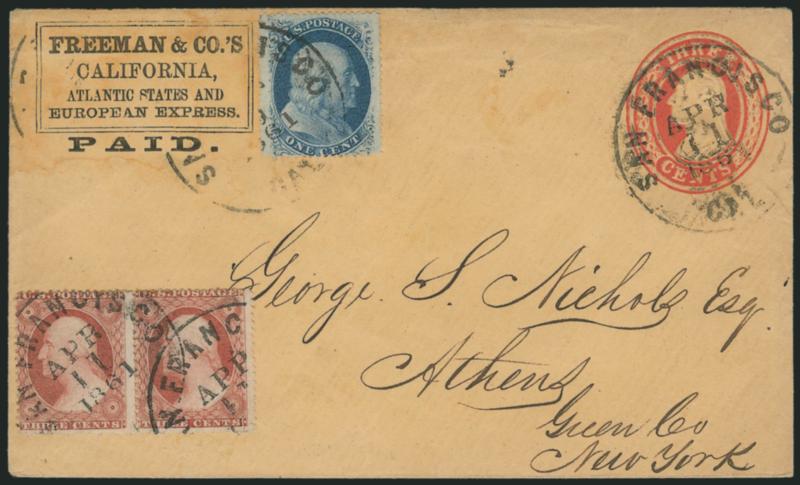 1160 c ImageFreeman & Co.'s California, Atlantic States and European Express. Printed frank (Haller FF7, Ty. 1) on 3c Red Nesbitt entire (U10) to Athens N.Y., uprated with 1c Blue, Ty. V and pair of 3c Dull Red, Ty. III (24, 26), tied by "San Francisco Cal. Apr. 11, 1861" circular datestamp, 3c stamps originally affixed over obsolete frank (lifted and hinged at lower left), Very Fine, by 1861 Freeman was out of business, but a few of the franked 3c entires were used in the Nichols correspondence (see Nathan p. 82 for another similar example), a fascinating use, with 1983 P.F. certificate (Image)