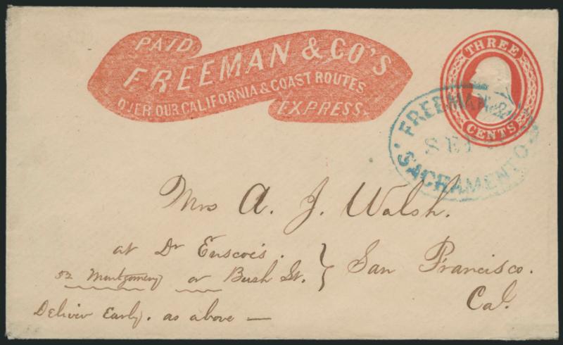 1162 c ImageFreeman & Co.'s Express. Red printed frank in banner (Haller FF7, Ty. 3a with star) on 3c Red Nesbitt entire (U9) to San Francisco, blue "Freeman & Co. Sacramento Sep. 23" oval datestamp, sender's instructions to "Deliver Early" to street address, Very Fine, colorful and choice Freeman use (Image)