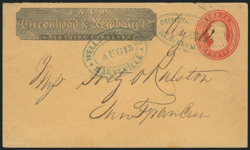 1165 c ImageGreenhood & Newbauer Northern Express. Printed frank (Haller FG6, Ty. 1) on 3c Red Nesbitt entire (U10) to San Francisco, blue "Greenhood & Newbauer's Express, Weaverville Cal." double-line oval handstamp and ms. "Ag 11" date, conjunctive use with "Wells, Fargo & Co. Marysville Aug. 13" oval datestamp, trivial tear at top above embossed stamp, otherwise Very Fine, desirable conjunctive use with Wells, Fargo & Co. providing service from Marysville to San Francisco (Image)