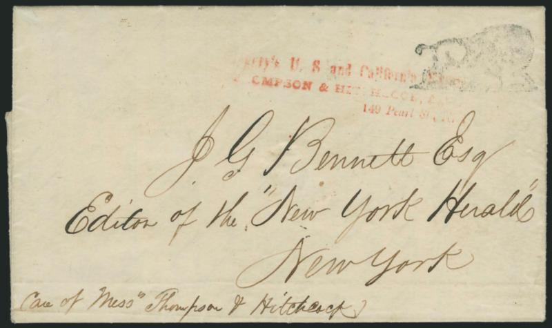 1168 c ImageGregory's U.S. and California Express, Thompson & Hitchcock, Agts., 149 Pearl St., N.Y. Partly clear red three-line handstamp and Bison pictorial handstamp on Jun. 30, 1850 folded letter from Joseph W. Gregory to James Gordon Bennett at The New York Herald in New York City, "Gregory's New York & California Express" oval handstamp used as a letterhead, in his letter Gregory sends a parcel of Yellow Monkey Flower seeds to Bennett as a gift and offers to send more examples to Bennett and his associates (Gregory's skill in wooing the press was no doubt part of his formula for success), the enigmatic Bison marking is also found on other covers from California, but its meaning and source have never been clear to us -- a wonderful express cover, ex Hahn (Image)