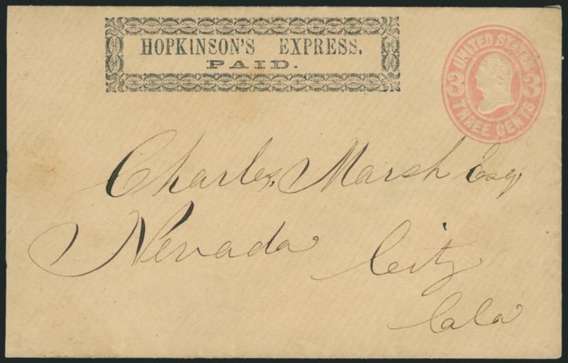 1169 c Hopkinson's Express. Printed frank in ornamental border (Haller FH13, Ty. 2a) on 3c Pink entire (U59) to Nevada City Cal., ms. "WF -3/4" over indicia, possibly indicating Wells Fargo conjunctive handling, small repairs at top corners, indicia slightly oxidized, otherwise Very Fine, extremely rare frank from Hopkinson's second term of ownership (1865-on), ex Hackett