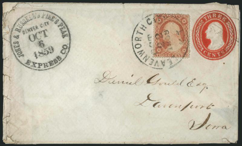 1171 c ImageJones & Russell's Pike's Peak Express Co., Denver City, Oct. 6, 1859". Circular datestamp boldly struck on 3c Red Nesbitt entire to Davenport, Iowa, with 3c Dull Red, Ty. III (26) tied by "Leavanworth City K. T. Oct. 22, 1859" circular datestamp, edge flaws (some repaired) and with right flap removed, still Fine, scarce, this express company was started by William H. Russell and his partners, it was taken over by the Central Overland California and Pike's Peak Express Co. of Pony Express fame when its debts became too burdensome, ex Senchuk (Image)