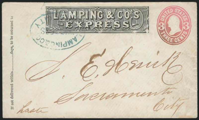1173 c ImageLamping & Co.'s Express. Printed frank (Haller FL1, Ty. 1) on 3c Pink entire (U58) to Sacramento, "Lamping & Co. Express Crest. City" (Crescent City) oval handstamp, no other markings, carried exclusively by Lamping, Very Fine, scarce use (Image)