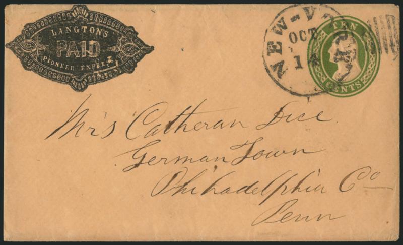 1174 c ImageLangton's Pioneer Express. Ornate printed frank (Haller FL3, Ty. 4) on 10c Green Nesbitt entire (U18) to Germantown Pa., carried by express outside the mails to New York and posted there, entered mails with "New-York Oct. 14" circular datestamp and grid cancel, Very Fine and scarce combination of express and regular mails (Image)