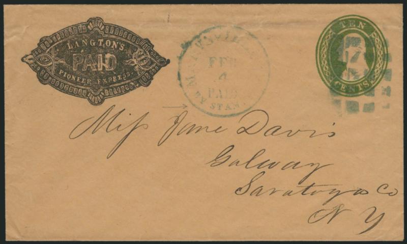 1175 c ImageLangton's Pioneer Express. Ornate printed frank (Haller FL3, Ty. 4) on 10c Green Nesbitt entire (U16) to Galway N.Y., entered mails with blue "Marysville Cal. Paid by Stamps Feb. 4" circular datestamp and matching large grid of squares cancel, Very Fine, unusually attractive and scarce combination of express and regular mails (Image)
