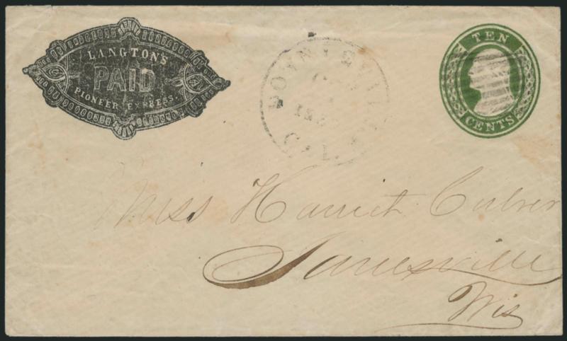1177 c ImageLangton's Pioneer Express. Ornate printed frank (Haller FL3, Ty. 4) on 10c Green Nesbitt entire (U15) to Jamesville Wis., entered mails with "Downieville Cal. Oct. 2, 1860(?)" circular datestamp, Very Fine, scarce combination of express and regular mails (Image)