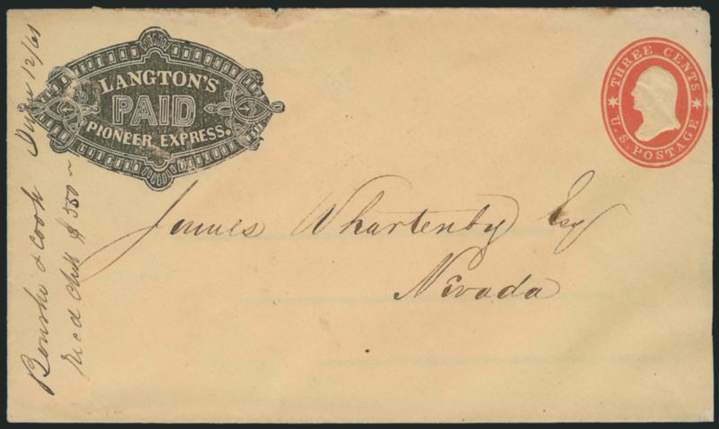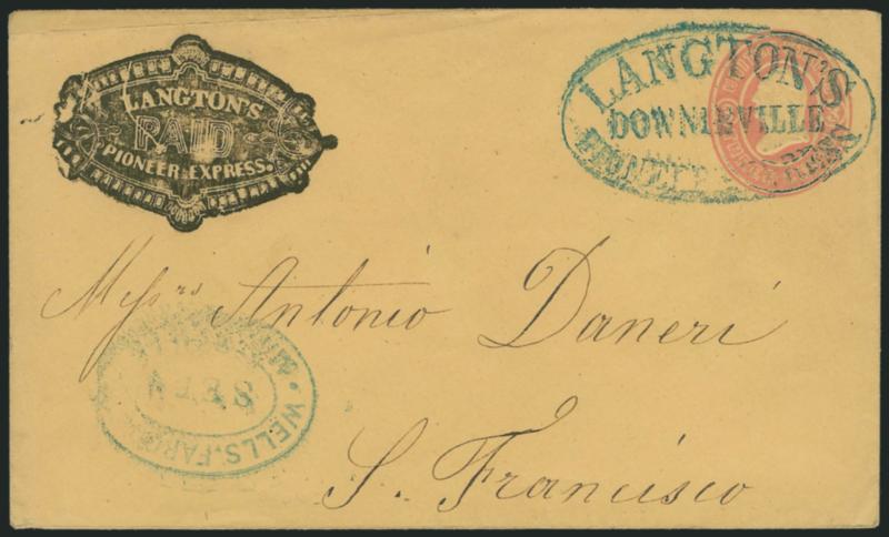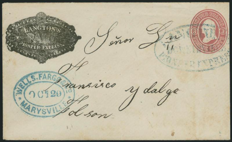 1178 c ImageLangton's Pioneer Express. Ornate printed and embossed frank (Haller FL3, Ty. 5) on 3c Pink entire (U35) to San Francisco, blue "Langton's Pioneer Express, Downieville" oval handstamp, conjunctive use with blue "Wells, Fargo & Co. Marysville Sep. 7" oval datestamp, Very Fine, the embossed frank is scarce (Image)