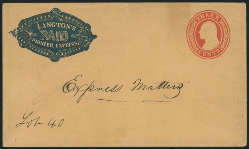 1179 c ImageLangton's Pioneer Express. Ornate printed frank embossed in blue (Haller FL3, Ty. 5) on 3c Red Nesbitt entire (U10), evidently unused with contemporary ms. "Express Matters...Lot 40" notation, Very Fine, Haller lists the Type 5 frank in blue on U34, but not on U10 (Image)