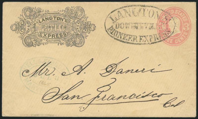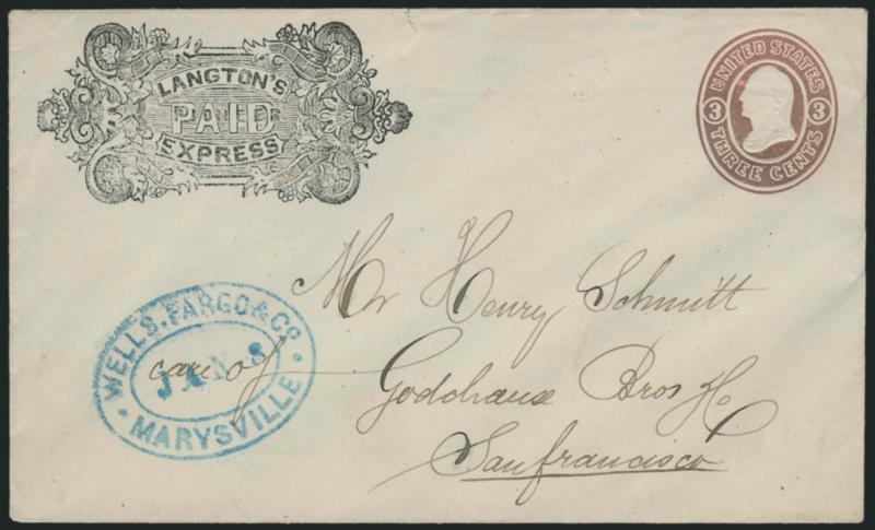 1182 c ImageLangton's Pioneer Express. Ornate printed frank (Haller FL3, Ty. 6) on 3c Pink entire (U59) to San Francisco, "Langton's Pioneer Express Downieville" oval handstamp, conjunctive use with blue "Wells, Fargo & Co. Marysville Jul. 3" oval datestamp, fresh and Extremely Fine (Image)