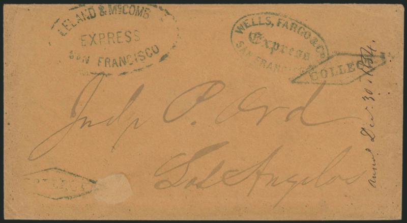 1185 c ImageLeland & McComb Express, San Francisco. Large blue double-line oval handstamp in conjunction with blue "Wells, Fargo & Co. Express San Francisco" oval and two strikes of "Collect" in diamond handstamp on brown cover to Los Angeles, docketed with Dec. 30, 1854 reply date, small scuff, otherwise Very Fine, an extremely rare express use, in 1853 George Leland and John McCombe started their express business, carrying mail by water between San Francisco and Crescent City, Port Orford and other towns in Humboldt Bay, their partnership was dissolved in June 1854, and Leland formed a new partnership with David McComb (without the "e"), serving the same area and expanding in August 1854 with a South Coast express to Monterey, Santa Barbara, San Pedro, Los Angeles and San Diego, ex Pearce, Haas, Kramer (Image)