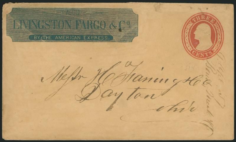 1186 c ImageLivingston, Fargo & Co. (By the American Express). Blue printed frank (Haller FL6) on 3c Red Nesbitt entire (U9) to H. Faning & Co. in Dayton O., docketed at right with Apr. 9, 1857 date, slightly toned, Fine, a rare frank and one of the few with a year date (Image)
