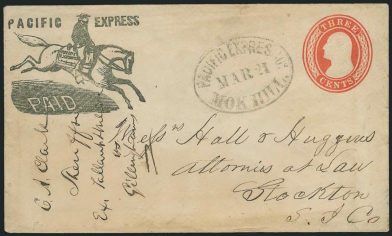 1188 c ImagePacific Express Co. Horse and rider frank (Haller P1, Ty. 1) on 3c Red Nesbitt entire (U9) to Stockton Cal., "Pacific Express Co. Mok. Hill Mar. 21" oval datestamp, ms. docketing, faint toning mostly on back edges, still Very Fine, scarce early frank (Image)
