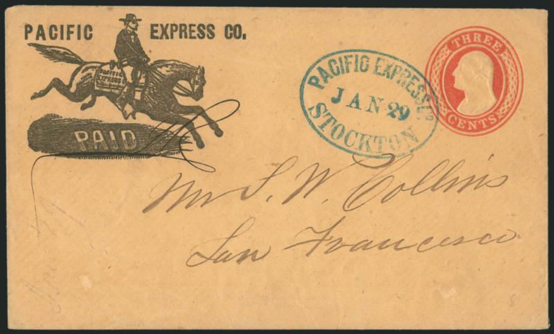 1191 c ImagePacific Express Co. Horse and rider frank (Haller FP1, Ty. 3), bold strike of blue "Pacific Express Co. Stockton Jan. 29" oval handstamp, with ms. "LR" initials of Levi Robie, on 3c Red Nesbitt entire (U10) to San Francisco, "Hewlett & Collins Stockton, Importers & Dealers in General Merchandise" handstamp on back, Very Fine, scarce (Image)