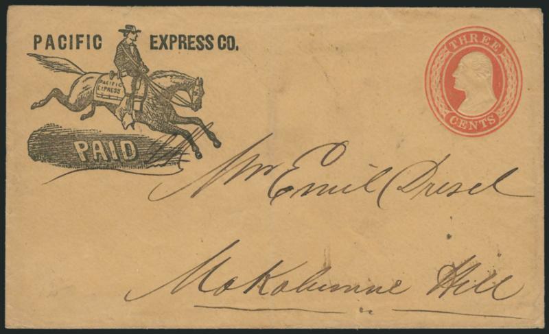1190 c Pacific Express Co. Horse and rider frank (Haller FP1, Ty. 2) on 3c Red Nesbitt entire (U10) addressed to "Noisy Carriers Hall, San Francisco", wax seals on back indicate paste-up use, Extremely Fine, unusual